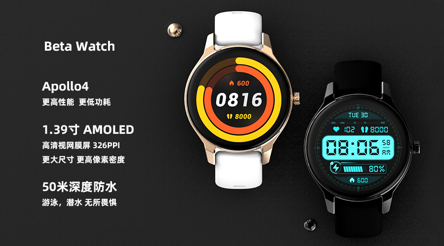 Beta Watch采用大尺寸高清视网膜屏,搭载Apollo4,更高性能、低功耗。配备小表径表盘,颜值超高,是时尚腕表,更是智能管家。